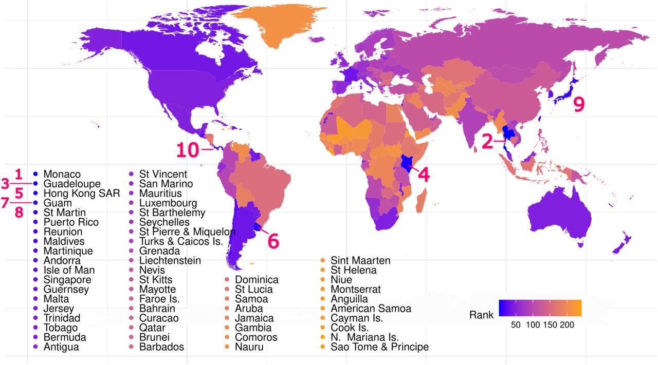 However, that’s not the case for centenarian attainment. Dr. Newman’s analysis shows that the countries which have the highest centenarian attainment - remember, people living from 80 to 100+ - are…unexpected. The top 10 countries regularly includes Guam, Guadeloupe, Kenya, Thailand, and the unincorporated territory of Western Sahara.